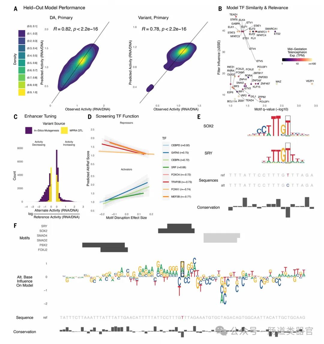 研究中的关键发现是,大脑类器官和原代细胞在lentiMPRA实验中表现出高度一致的活性,这表明类器官可以作为研究发育皮层调节景观的适当模型。此外,深度学习模型能够以最先进的准确性预测lentiMPRA活性,这使得研究者能够学习人类大脑发育中调控活性的序列决定因素,并将转录因子分类为抑制因子与激活因子,并预测对调控活性有重大影响的核苷酸变化。